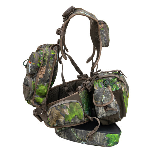 The Deluxe Long Spur Versatile Turkey Hunting Vest System features an attached, removable, thick-padded memory foam seat that easily folds away. The shoulder harness is removable and includes a large game bag. Other features include a removable padded waist belt with zippered pockets and removable protective diaphragm call pocket. Fully adjustable with multiple webbing strap options. Easily removable 500 in3 lumbar pack for run-and-gun style hunts. The two removable chest pockets include a protective and silent box call pocket, two slate call pockets, five shell loops, locator call pockets and two mesh mouth call pockets. Vest only weighs 4 lbs. 4 oz. and is available in Mossy Oak Obsession.