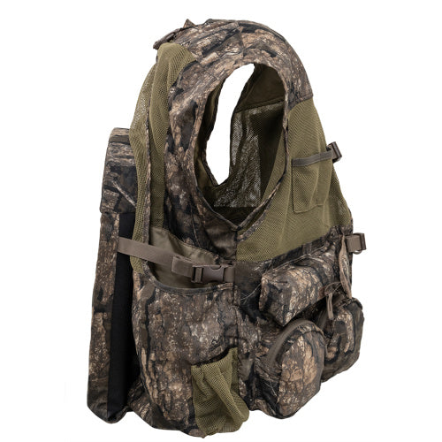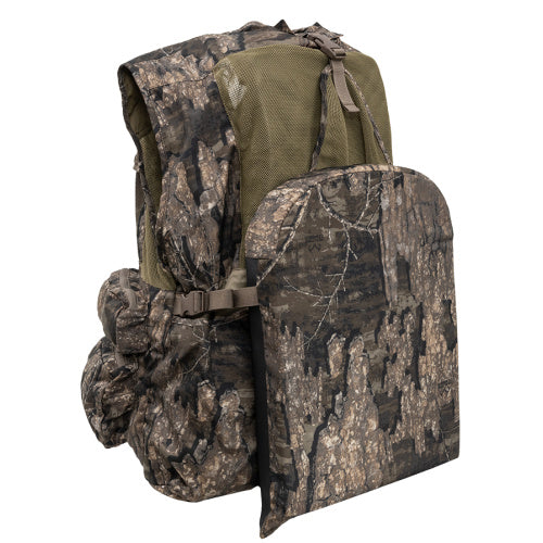 The Super Elite 4.0 is the perfect turkey vest for every hunter. Whether you take only the essentials or prefer to have an arsenal of gear at your disposal, the Super Elite 4.0 turkey vest is sure to fit every turkey hunter's specific needs. The Super Elite features a total of 22 pockets, including two large slate call pockets, three striker pockets, a box call pocket, two mesh diaphragm call pockets and an easy access cell phone pocket. In addition to the multitude of pockets, a removable 2.5 inch thick fold away seat allows you to sit anywhere without having to carry an extra seat. A blood proof breathable game is included for carrying gear out to the field or game back from the field. The Super Elite 4.0 is constructed using a quiet cotton liner and has breathable mesh panels throughout.