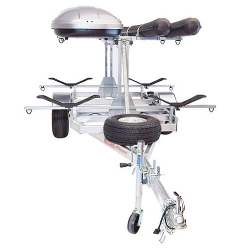 The MPG550-LBM is a MegaSport™ LowBed™ Trailer fully outfitted with a 2nd Tier Kit, MPG910 Profile™ Roof Box, 2 sets of Rod Tubes, two sets of MPG207 MegaWing™ Kayak Carriers and a Spare Tire with Locking Attachment. This set-up represents one of our "Pro Level" offerings for transport of multiple large fishing kayaks with traditional center beam hull configurations.