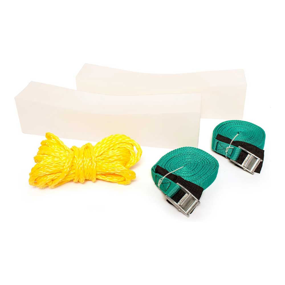 - Comes with two 16" closed-cell V shaped foam blocks, two 1" x 16" cam lock tie down straps, and 40' of front and back bumper down line