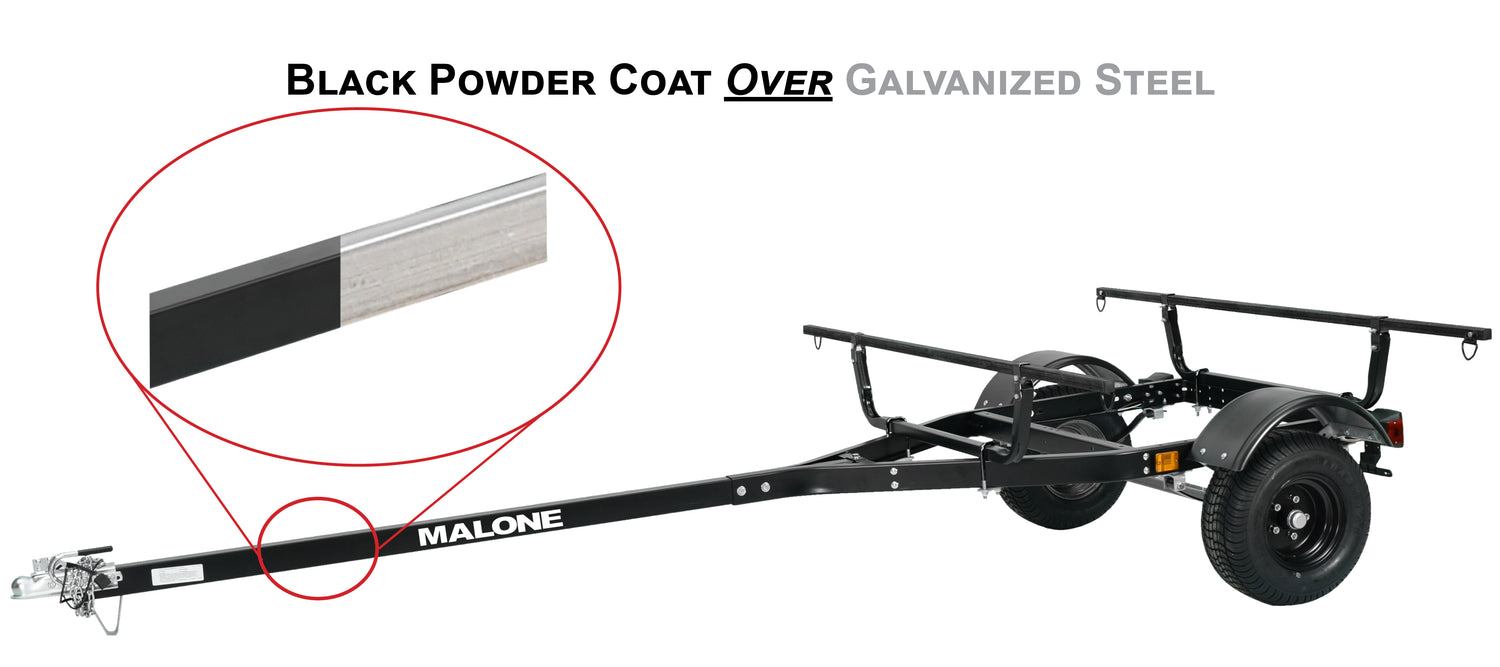 - Trailer Frame: Black powder coated, marine grade pre-galvanized steel