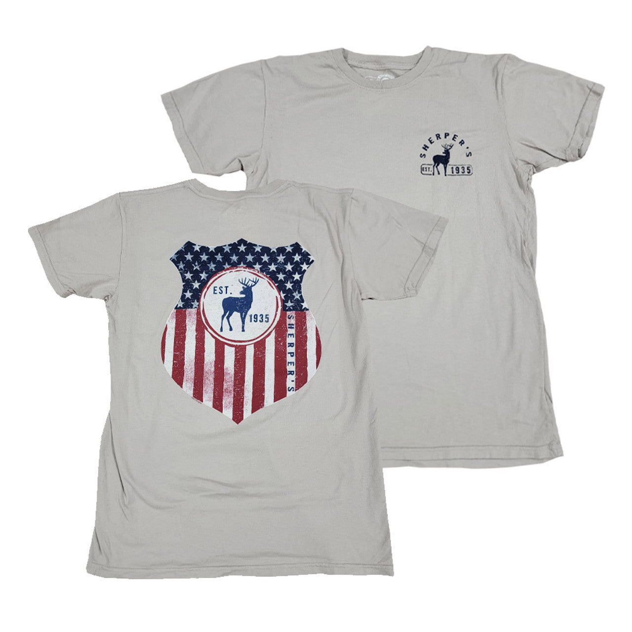 - Features a front deer and Sherper's design print, with large flag inspired design on the back.