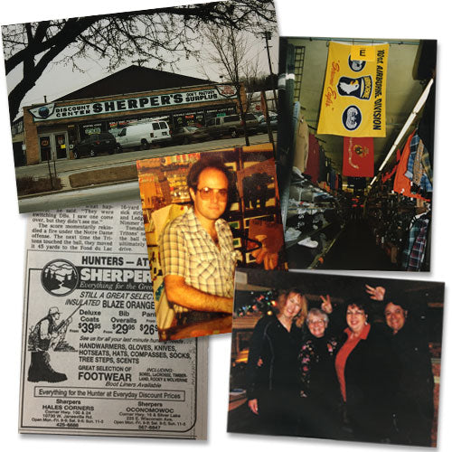 In the early 40's we were re-incorporated as Sherper's Inc. As you might notice the store is spelled "Sherper's" where our last name has a "C" in it (Scherper). The reason for this is when Sam went to go buy a sign for the store, he only had enough money in the bank for the size of sign that could fit 8 letters, so he dropped the "C" from the name so that he could afford the sign.