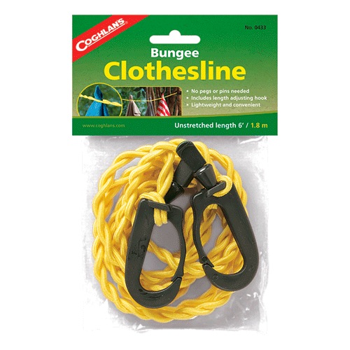 No clothes pegs needed. Lightweight and convenient clothesline perfect for camping. Unstretched length is 6' (1.8 m). Perfect for the campsite, RV, or cabin.