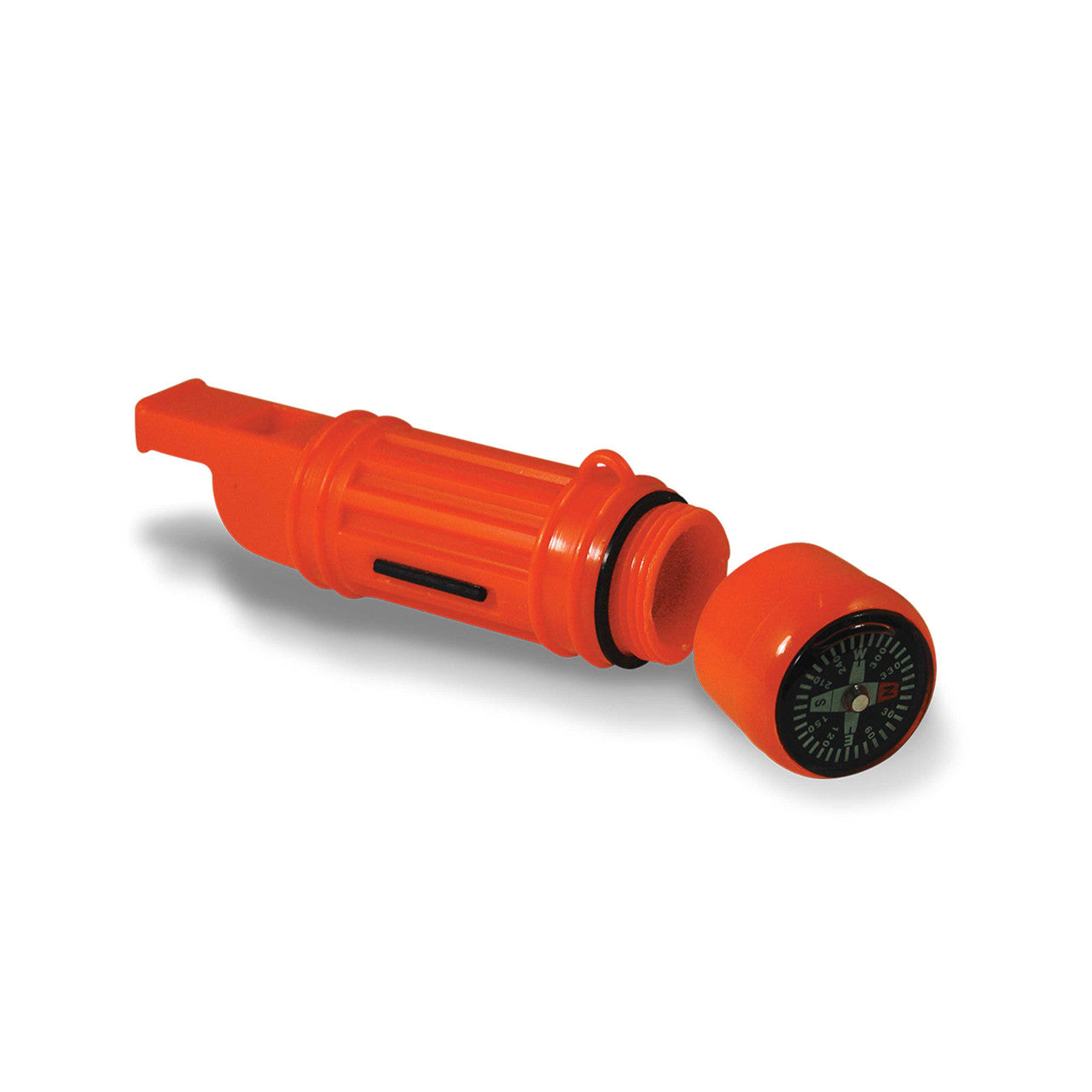 A waterproof match box, liquid filled dial compass, fire starter flint, signal mirror and a signal whistle are all contained within the 5-In-1 Survival Aid. Nylon lanyard included.