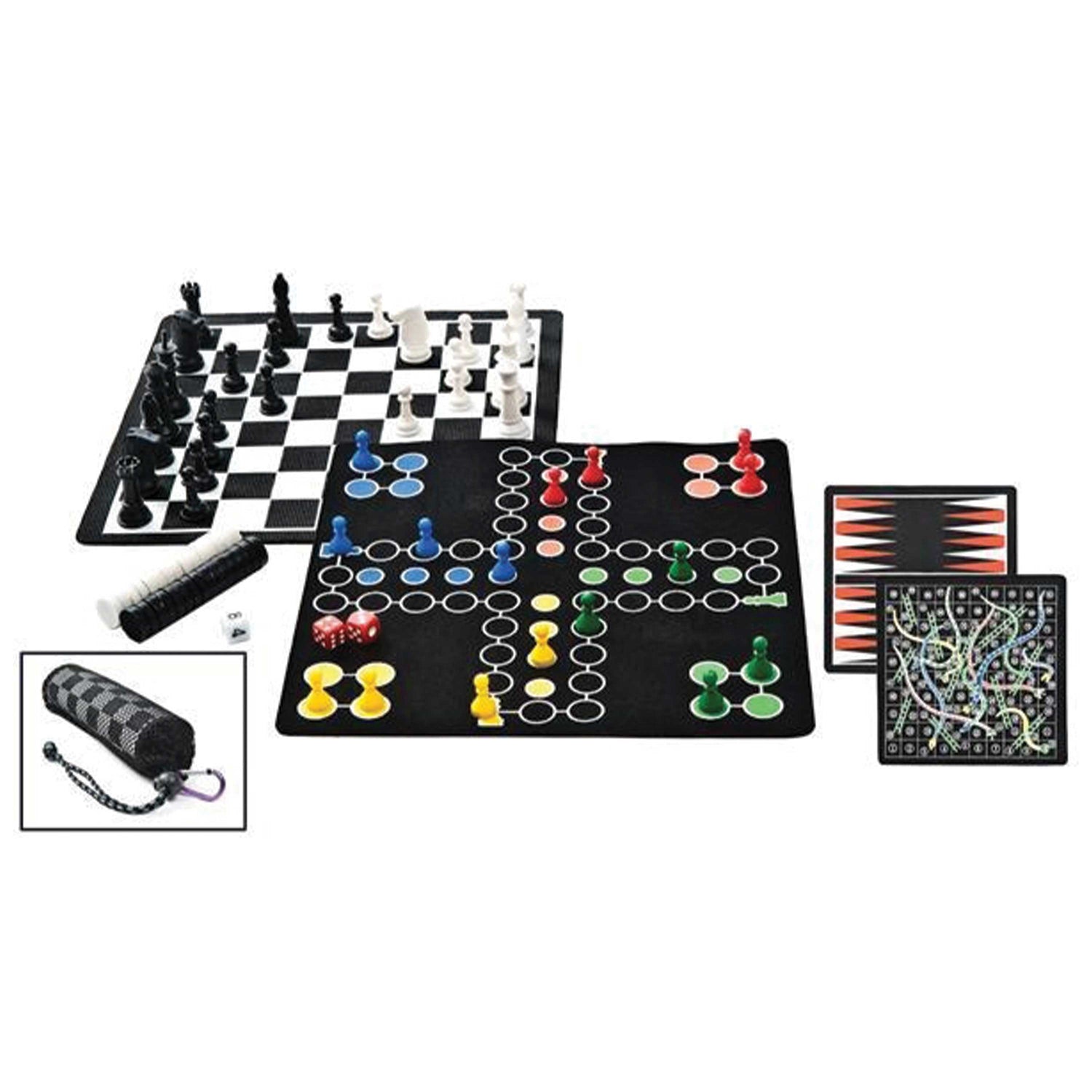 - Includes (2) Two-Sided game boards and all pieces to play; chess, checkers, backgammon, ludo and snakes and ladders / Game instructions / (1) Carrying case
